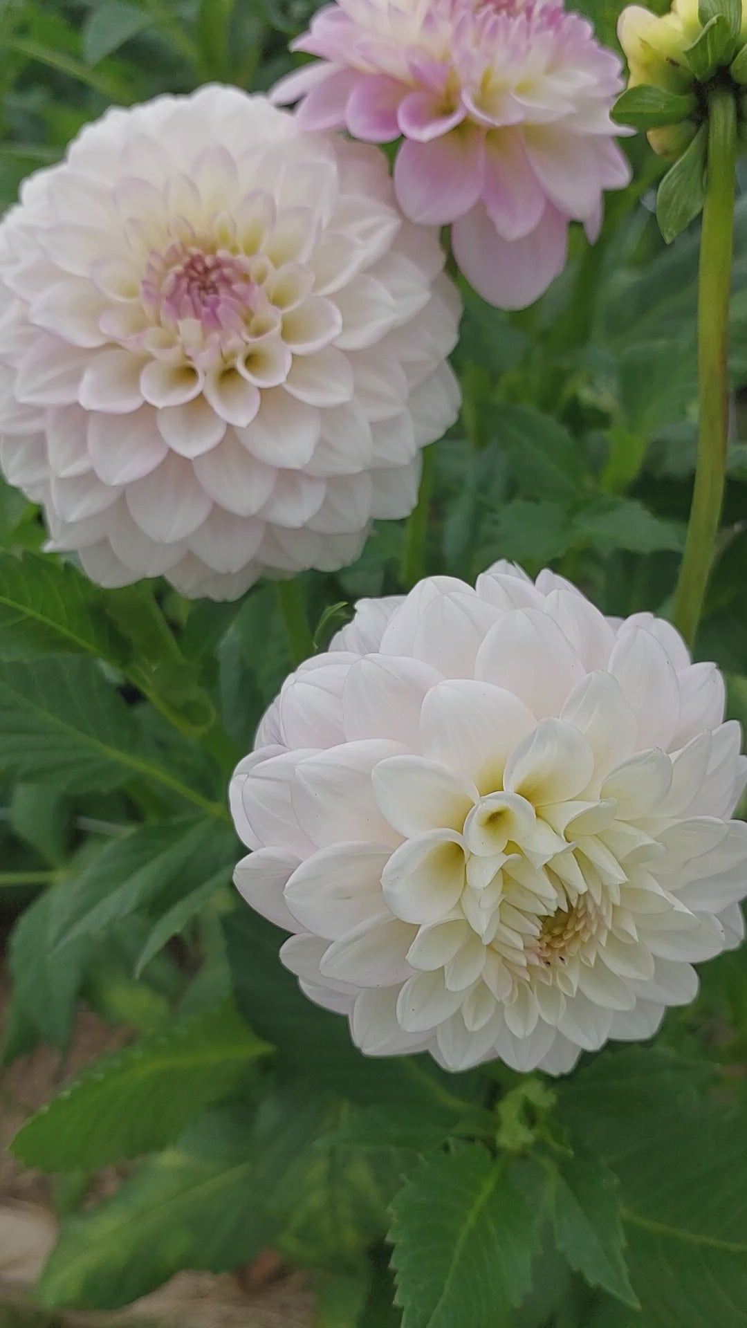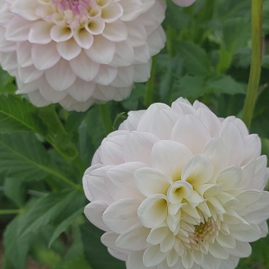 A light blush ball dahlia whose petals look like they have been brushed with the lightest stroke of pink sherbet, with the edge of each petal outlined with the same pink. A beautiful, strong dahlia that is fantastic for wedding work and bouquets