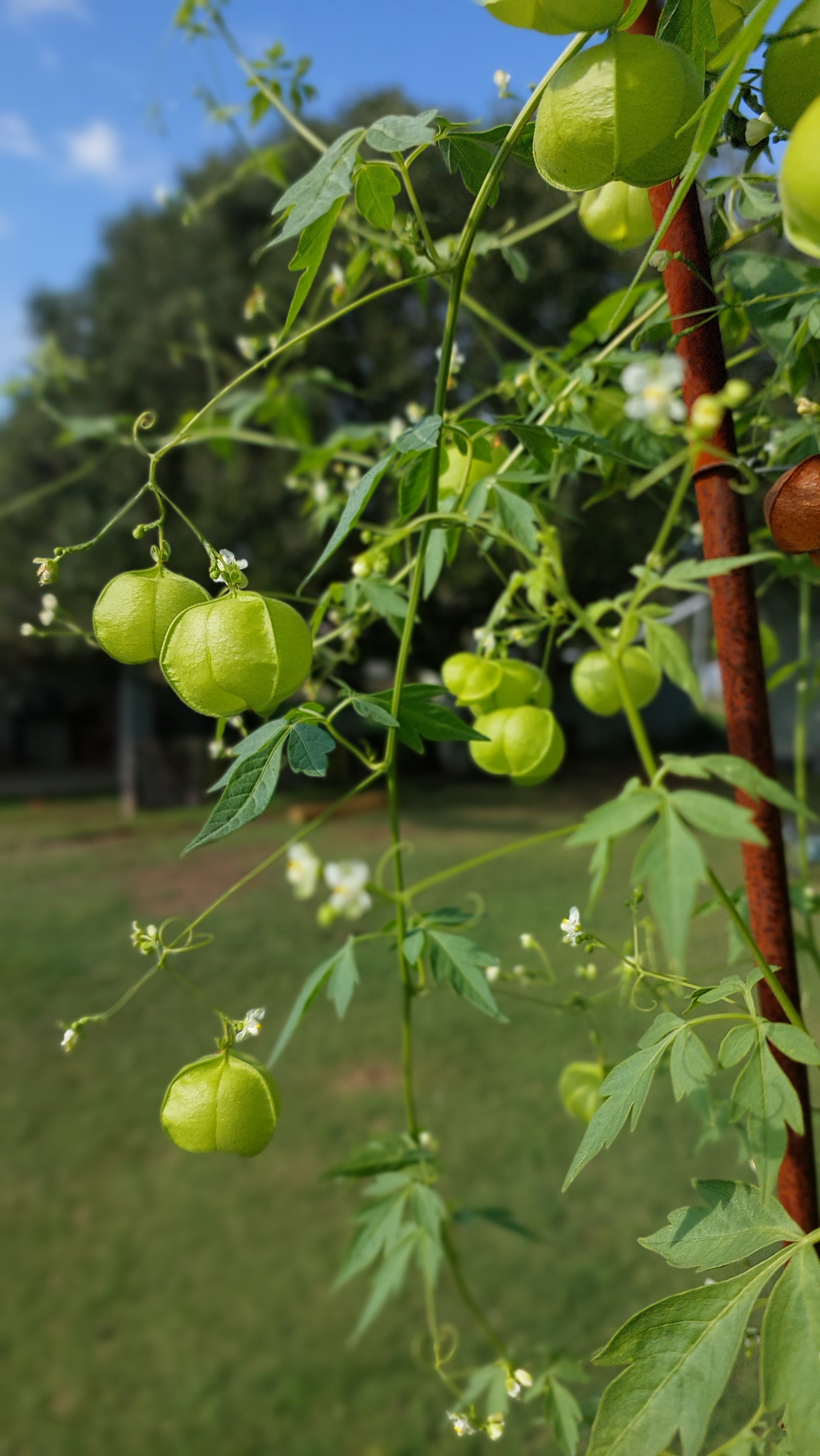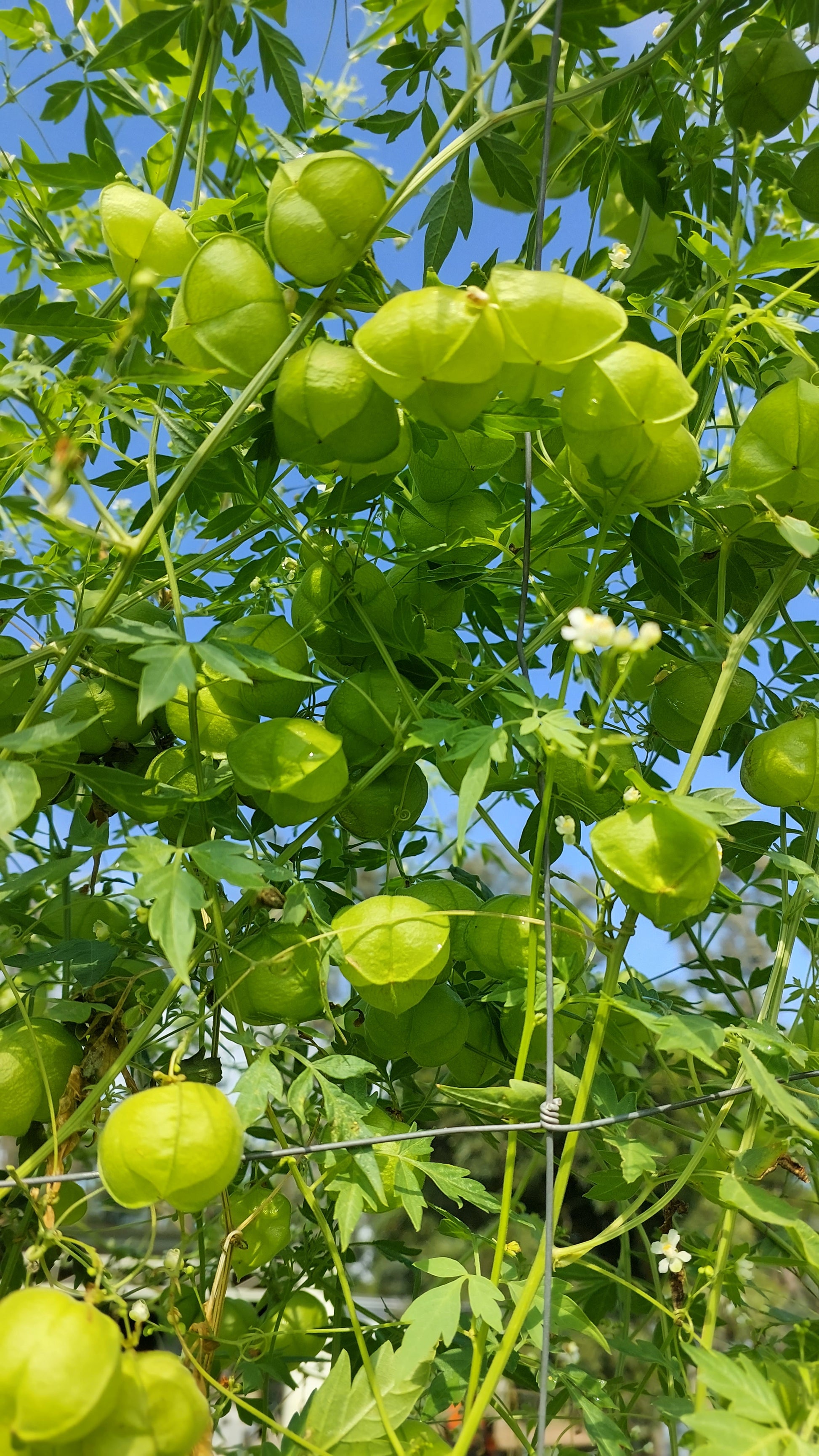 A wonderful, elegant yet tough annual creeper that produces long delicate-looking stems with serrated leaves in the freshest green. First come the tiny white flowers, followed by the small 1-2cm wide seed pods, each of which produces 2 or 3 perfectly round seeds which, when mature are black all over with a perfect white heart on each seed - hence the name!