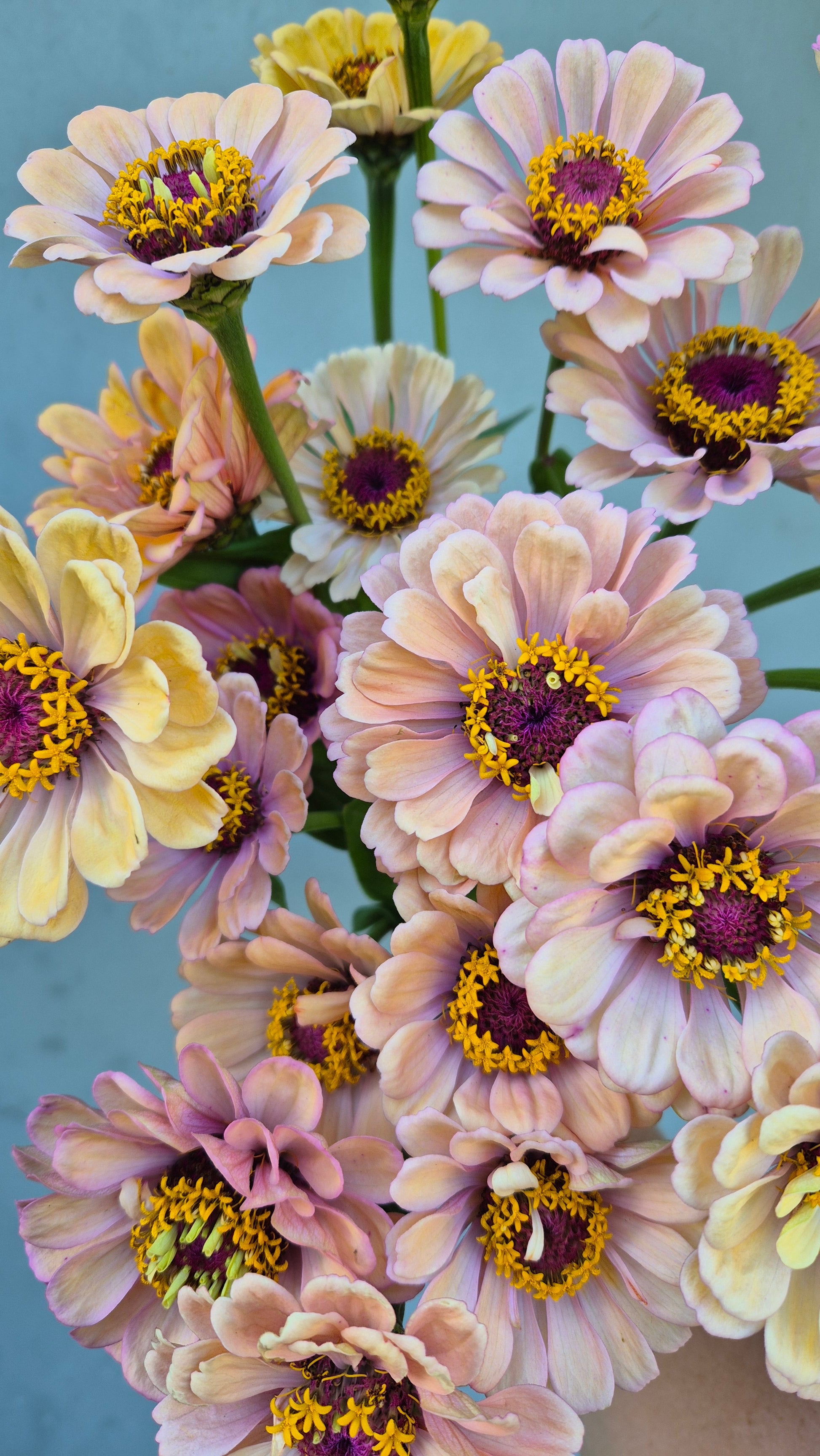 These Zinnias are the most exquisite combinations of pale peach, pink and soft linen with the smallest hint of butter yellow, making them a designers dream to arrange with. The versatility of the colour range means they can work with almost any colour palette, and are equally spectacular in a bunch of just themselves alone.